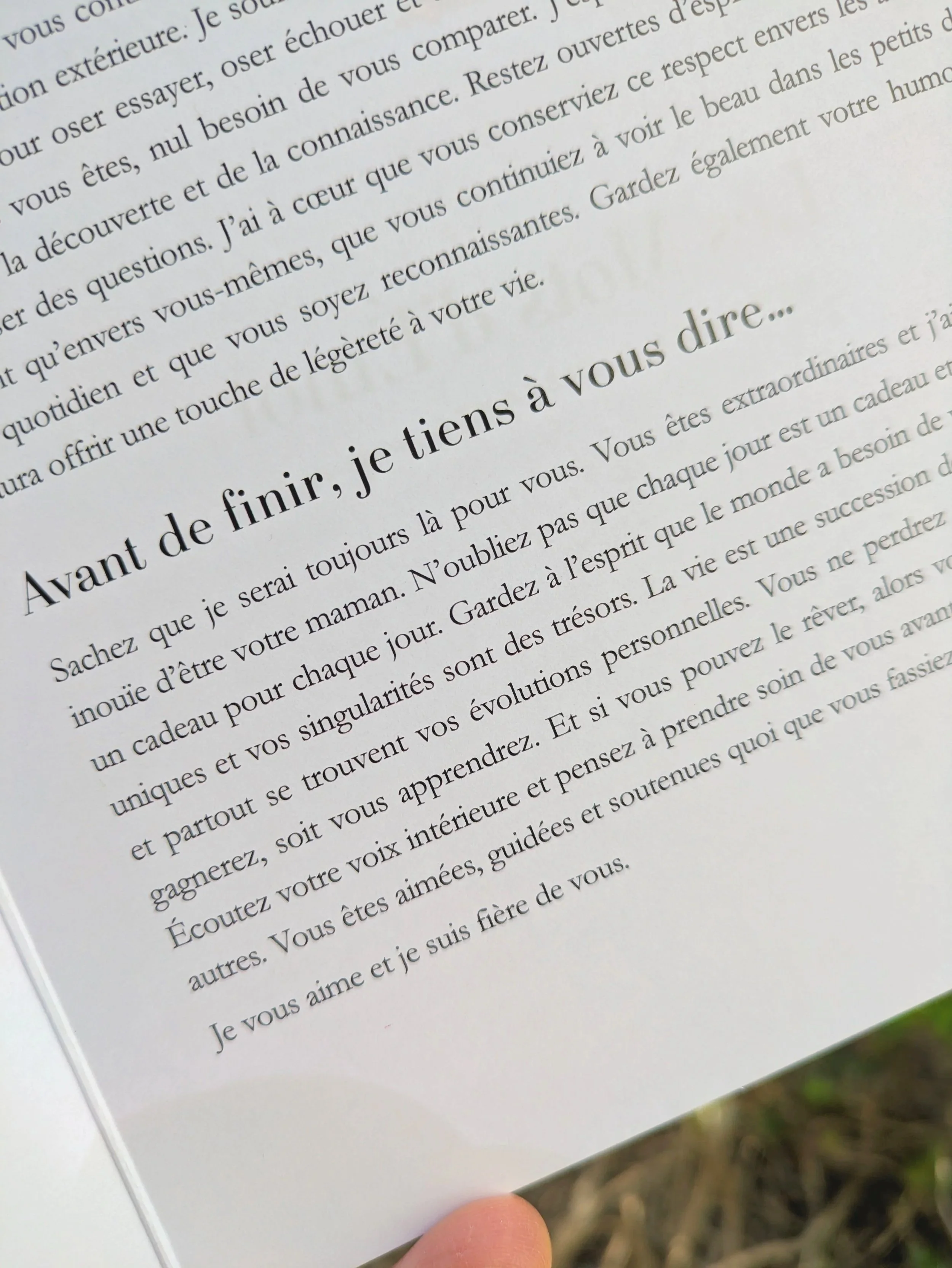 Je réécris votre témoignage en restant fidèle à vos mots, le retravaille afin qu'il se lise avec fluidité et émotion, puis le mets en page avec soin. Vous recevez ensuite votre lettre imprimée sur un beau papier, illustrée et prête à être offerte.